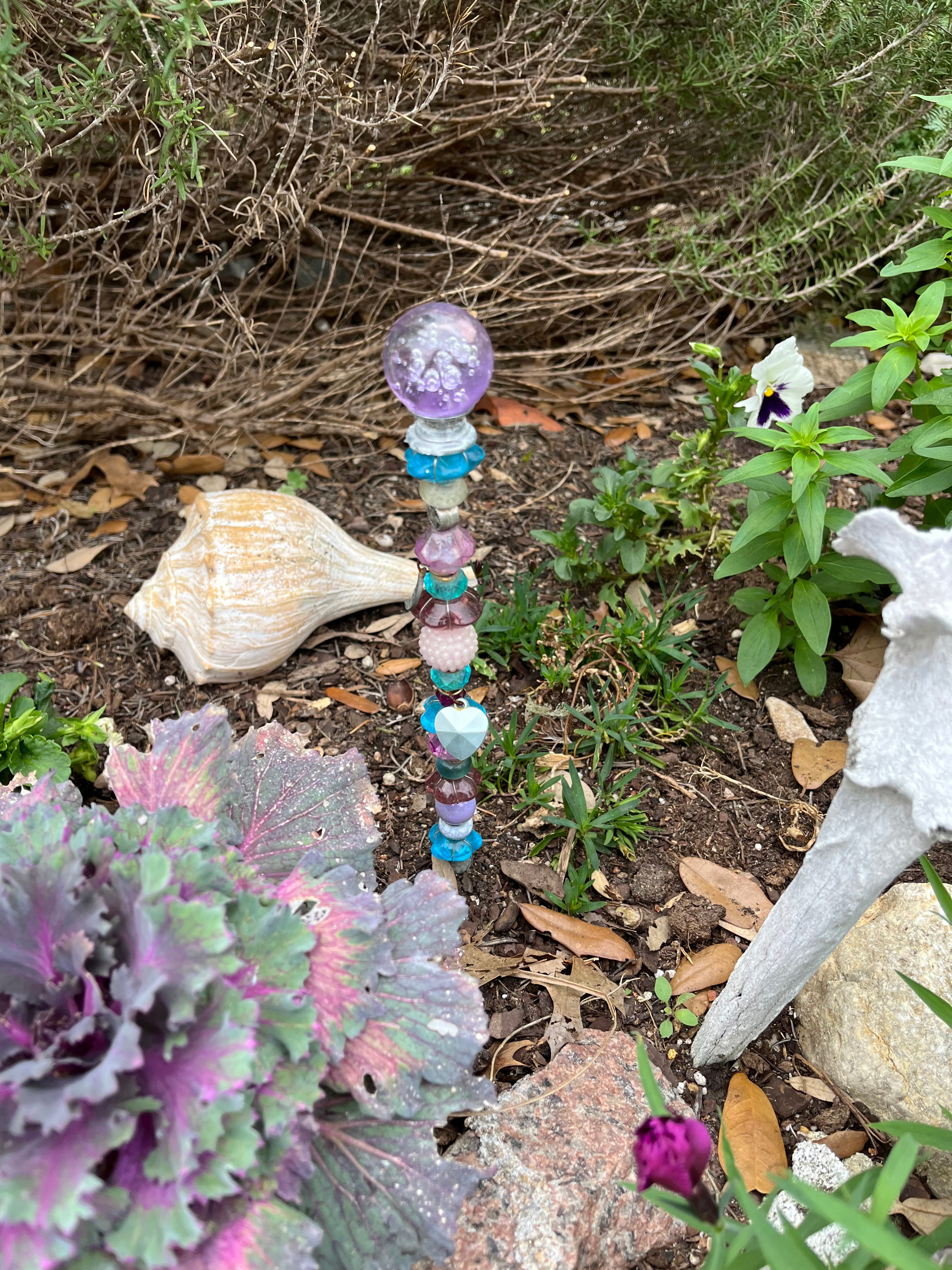 The other day I passed by a neighbor’s house and noticed this colorful doodad in her garden. I’ve complimented this neighbor on her flowers many times, so I just said “lovely doodad” and took a picture.